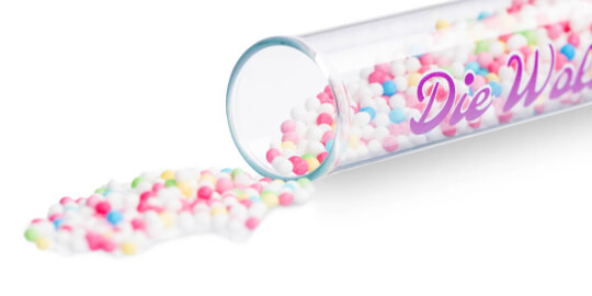 Schokolinsen, Mandeln oder auch Goldstaub. Egal, womit du die Reagenzgläser bestückst, ein kleines Geschenk auf Hochzeiten muss einfach sein – damit bleibt der besondere Tag bei den Gästen im Gedächtnis. Setze bei dieser schönen Tradition nicht auf Geschenke von der Stange, wir bedrucken die Gläser und geben deiner Kreativität damit völlig neue Möglichkeiten. Bestimme den Aufdruck und Inhalt selbst. Im Grunde kannst du alles verschenken, was in das Reagenzglas passt.